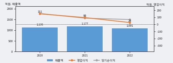 일진하이솔루스의 2022년 매출액은 전년대비 -7.3% 줄어든 1091억원이고, 영업이익 역시 전년대비 -71.7% 줄어든 28억원을 기록했다. 이 회사의 매출액 증감률과 영업이익 증감률은 각각 코스피 하위 8%, 하위 13%에 해당된다.