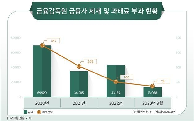 1일 기업데이터연구소 CEO스코어가 지난 2020년부터 올해 10월 말까지 금융감독원의 금융사 제재 현황을 분석한 결과, 금융사 608곳이 총 730건의 제재를 받은 것으로 나타났다. 이에 따른 과태료(과징금 포함)는 총 1천604억2천700만원으로 집계됐다.