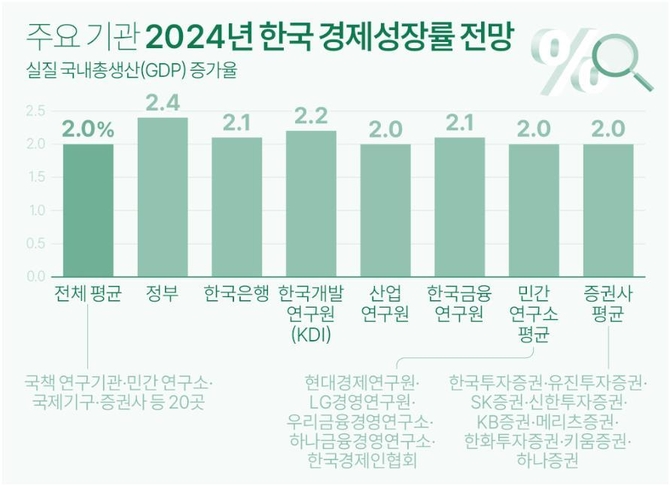 민간 경제연구소와 증권사 리서치센터들은 상대적으로 더 낮은 전망치를 내놨다. 현대경제연구원과 LG경영연구원, 우리금융경영연구소, 하나금융경영연구소, 한국경제인협회는 내년 한국경제가 평균 2.0% 성장할 것으로 봤다.