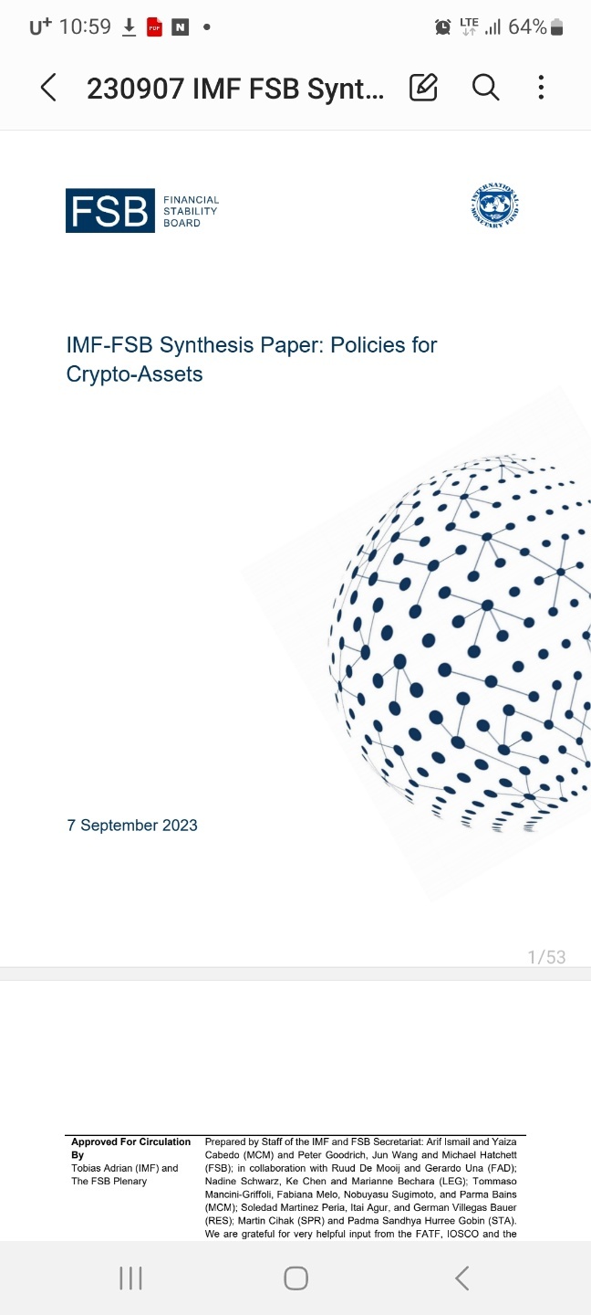 FSB-IMF는 지난해 9월 7일 가상자산 정책 통합 보고서(IMF-FSB Synthesis Paper : Policies for Crypto-Assets)를 공식 발표했다.