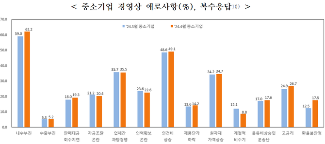 4월 중소기업들이 꼽는 부정적 요인은 내수부진(62.2%)이 가장 높았다(복수 응답 가능). 다음으로는 ▲인건비 상승(49.1%) ▲업체 간 과당경쟁(35.5%) ▲원자재가격 상승(34.7%) 순이었다.