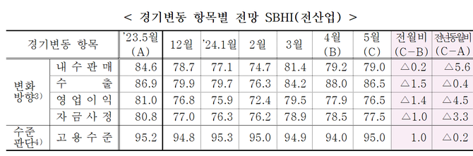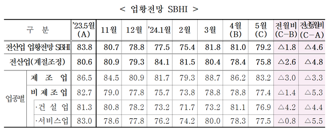 중소기업중앙회가 29일 공개한 5월 전산업 업황 경기 전망지수(SBHI)는 79.2로 전달 대비 1.8포인트 하락했다.