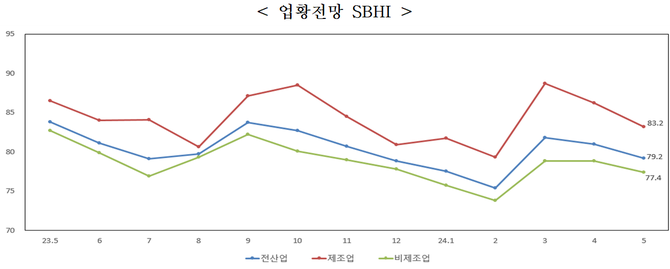 SBHI는 지난 1월 77.5, 2월 75.4였으나, 3월 81.8로 올랐으며, 4월 소폭 하락하긴 했지만 81.0에 머물렀다. 하지만 5월에는 79.2로 다시 70대로 지수가 내려갔다.