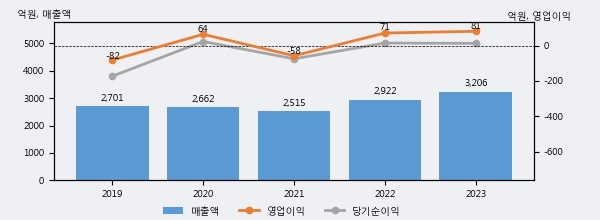 최근 실적을 살펴보면 2023년 매출액이 최근 5년 중 가장 높은 실적을 기록했음을 알 수 있다. 이전 최고 실적이었던 2022년 보다도 9.7%(284억 5천만원) 늘어난 것으로 나타났다.
