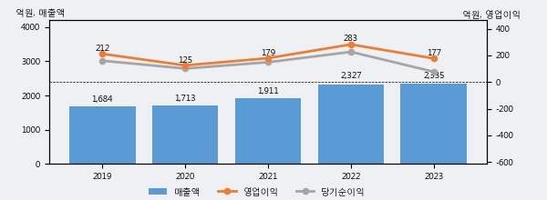최근 3년간의 실적을 살펴보면 안정적 성장세를 보이고 있다. 최근 3년간 매출로 볼 때 매년 꾸준히 증가하고 있다. 다만 최근에 그 증가폭이 다소 감소하고 있다.
