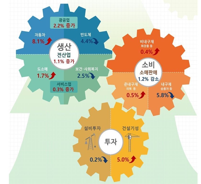 재화 소비를 보여주는 소매판매는 전월보다 1.2% 줄었다. 승용차, 통신기기·컴퓨터, 가구를 중심으로 내구재 판매가 5.8%로 위축 된 탓이다. 서비스업 소비를 반영하는 서비스 생산은 0.3% 증가했다.