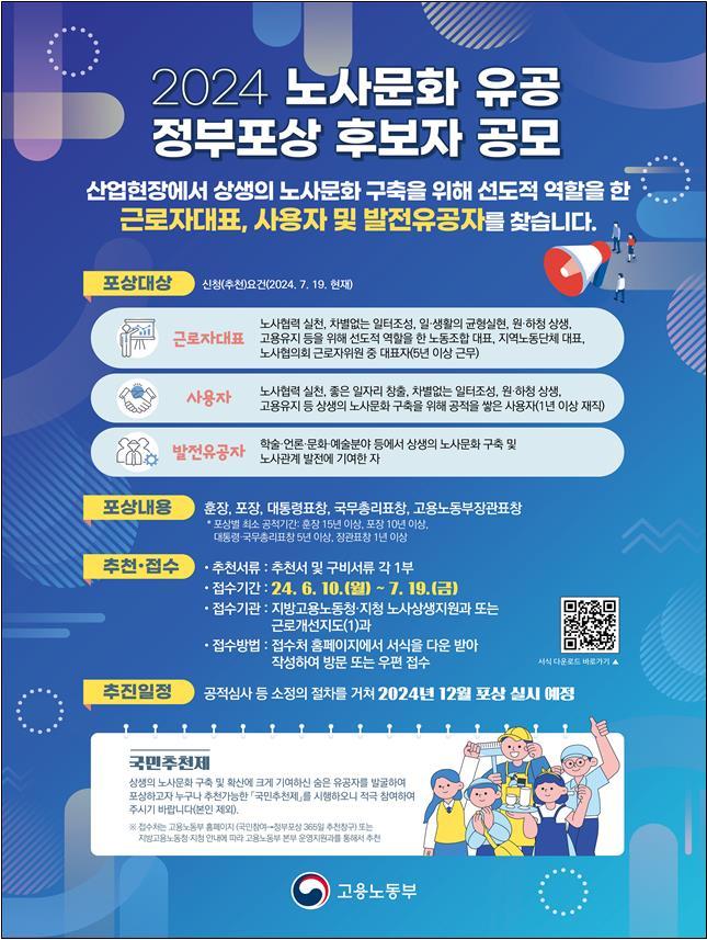 (조세금융신문=최주현 기자) 고용노동부는 9일 올해 노사문화 유공자 정부 포상 후보자를 10일부터 내달 19일까지 추천받는다고 밝혔다.