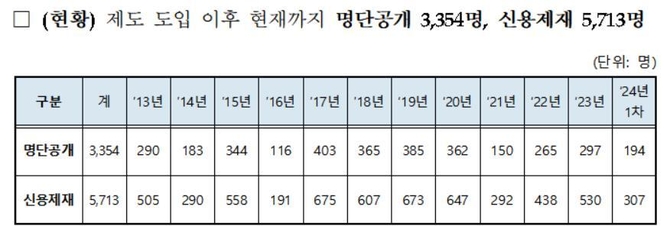 고의·상습 체불 사업주에 대한 명단 공개와 신용제재는 2013년 처음 시행됐으며, 지금까지 총 3천354명의 명단이 공개되고 5천713명이 신용제재를 받았다고 노동부는 밝혔다.