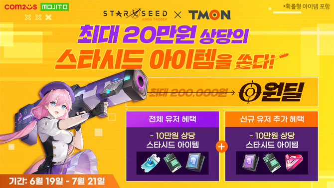 이벤트는 오는 7월 21일까지 진행된다. 우선 티몬은 ‘스타시드’ 쿠폰 0원딜을 열고 선착순 5만명에게 10만원 상당의 아이템을 무료로 제공한다. 쿠폰은 ▲마이닝 티켓 20장 ▲프록시안 모집권 10장 ▲SR 프록시안 영입권 10장 등으로 구성된다.
