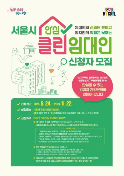시는 클린주택으로 인증받을 클린임대인을 11월 22일까지 모집하며, 신청은 서울시 종합지원센터로 방문 및 우편 접수하면 된다고 덧붙였다.
