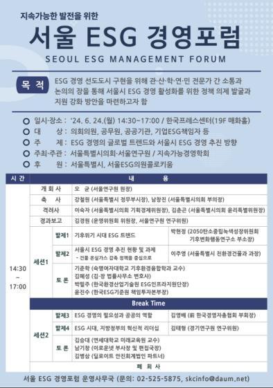 이번 포럼에는 기준학 숙명여대 교수, 김혜성 변호사 등이 참석해 서울시의 지속가능발전 목표를 논의하고 ESG 정책 방향 등에 관한 의견을 교환한다.