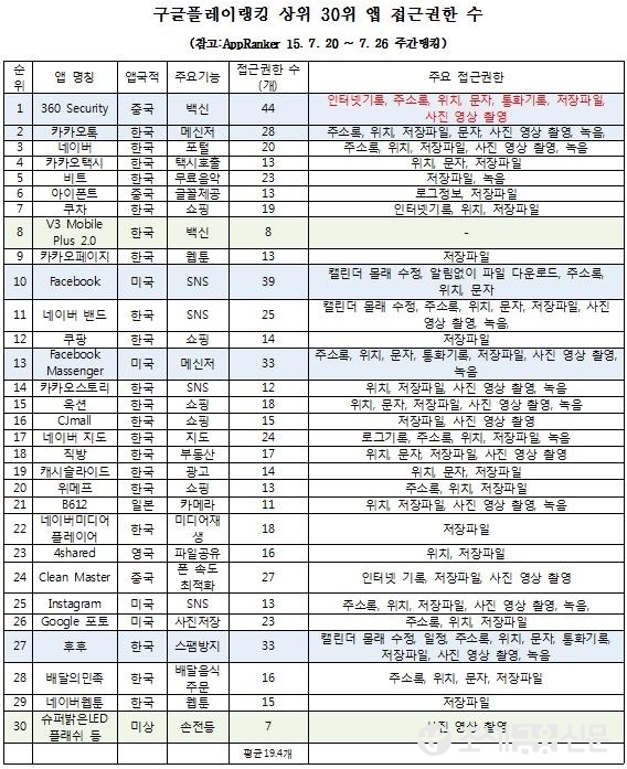 국회 새정치민주연합 김기식 의원(정무위원회)에 따르면 “구글플레이의 랭킹 상위 앱 30개를 분석한 결과(2015년 7월 넷째주 기준, 스마트폰 앱 전문 통계 분석 회사 App Ranker 참고), ‘접근권한’을 가장 많이 요구한 앱은 백신 앱 ‘360 Security’로 무려 44개의 권한을 요구하는 것으로 드러났다.