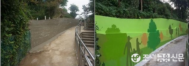 지난 6월 장마철에 대비하여 주민 안전을 고려해 대상 국유지에 옹벽 공사를 마무리하고, 8월말 국유재산 업무 담당직원들로 구성된 봉사단이 밑그림 및 내부 도색 작업에 참여해 길이 26m, 높이 1.4m 규모의 벽화를 완성, 어두운 분위기의 옹벽을 밝고 활기찬 모습으로 탈바꿈시켜 주민 친화적인 주거환경 조성에 일조했다.