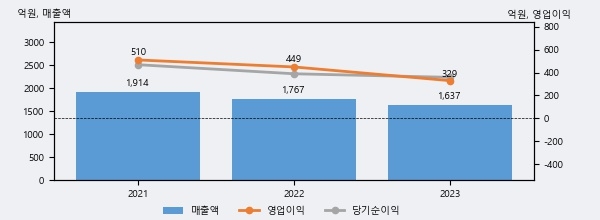 덕산네오룩스의 2023년 매출액은 1637억으로 전년대비 -7.3% 하락했고, 영업이익 역시 329억으로 전년대비 -26.6% 하락했다. 이 회사의 매출액 증감률과 영업이익 증감률은 각각 코스닥 하위 37%, 하위 44%에 해당된다.