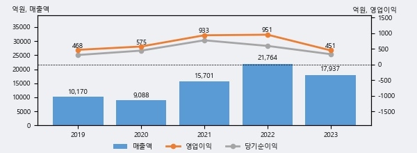 애경케미칼의 2023년 매출액은 1조 7937억으로 전년대비 -17.6% 하락했고, 영업이익 역시 451억으로 전년대비 -52.6% 하락했다. 이 회사의 매출액 증감률과 영업이익 증감률은 각각 코스피 하위 13%, 하위 24%에 해당된다.
