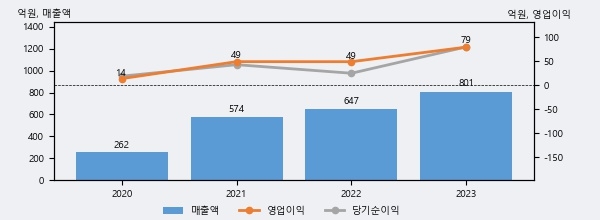 위더스제약의 2023년 매출액은 801억으로 전년대비 23.9% 상승했고, 영업이익 또한 79억으로 전년대비 62.1% 상승했다. 이 회사의 매출액 증감률과 영업이익 증감률은 각각 코스닥 상위 17%, 상위 20%에 해당된다.