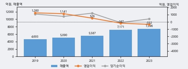 컴투스의 2023년 매출액은 7396억으로 전년대비 3.1% 상승했고, 영업이익은 -332억으로 전년에 이어 적자가 지속됐다. 이 회사의 매출액 증감률과 영업이익 증감률은 각각 코스닥 상위 45%, 하위 21%에 해당된다.