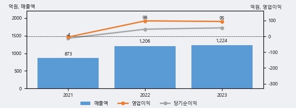 최근 실적을 살펴보면 2023년 매출액이 최근 3년 중 가장 높은 실적을 기록했음을 알 수 있다. 이전 최고 실적이었던 2022년 보다도 1.5%(17억 7천만원) 늘어난 것으로 나타났다.