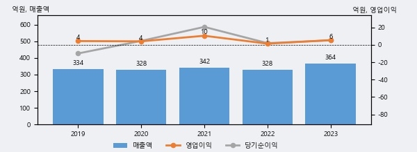 최근 실적을 살펴보면 2023년 매출액이 최근 5년 중 가장 높은 실적을 기록했음을 알 수 있다. 이전 최고 실적이었던 2021년 보다도 6.6%(22억 6천만원) 늘어난 것으로 나타났다.