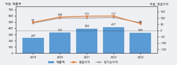 엠투아이는 2023년 매출액 330억원과 영업이익 56억원을 기록했다. 전년대비 매출은 -20.8%, 영업이익은 -51.9% 각각 하락했다. 이 회사의 매출액 증감률과 영업이익 증감률은 각각 코스닥 하위 20%, 하위 34%에 해당된다.