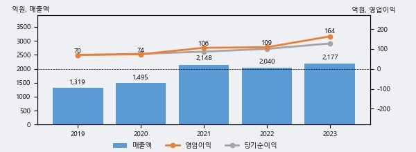최근 실적을 살펴보면 2023년 매출액이 최근 5년 중 가장 높은 실적을 기록했음을 알 수 있다. 이전 최고 실적이었던 2021년 보다도 1.4%(29억 2천만원) 늘어난 것으로 나타났다.