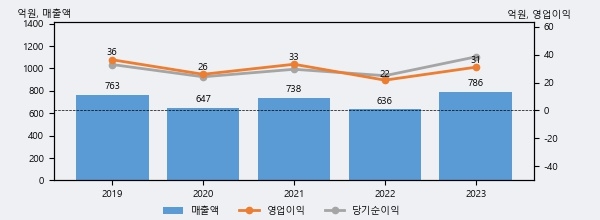 최근 실적을 살펴보면 2023년 매출액이 최근 5년 중 가장 높은 실적을 기록했음을 알 수 있다. 이전 최고 실적이었던 2019년 보다도 3.1%(23억 8천만원) 늘어난 것으로 나타났다.