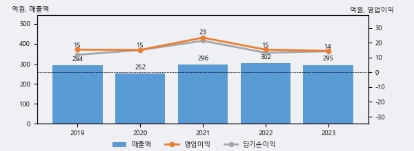 프럼파스트는 2023년 매출액 295억원과 영업이익 14억원을 기록했다. 전년대비 매출은 -2.5%, 영업이익은 -5.9% 각각 하락했다. 이 회사의 매출액 증감률과 영업이익 증감률은 각각 코스닥 하위 46%, 상위 45%에 해당된다.