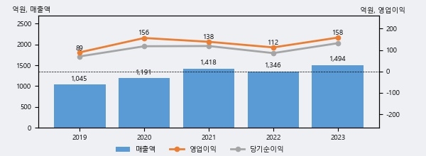 최근 실적을 살펴보면 2023년 매출액이 최근 5년 중 가장 높은 실적을 기록했음을 알 수 있다. 이전 최고 실적이었던 2021년 보다도 5.3%(75억 7천만원) 늘어난 것으로 나타났다.