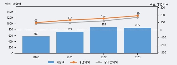 보광산업의 2023년 매출액은 전년대비 -2.3% 줄어든 855억원이고, 영업이익은 전년대비 23.0% 늘어난 189억원을 기록했다. 이 회사의 매출액 증감률과 영업이익 증감률은 각각 코스닥 하위 46%, 상위 30%에 해당된다.