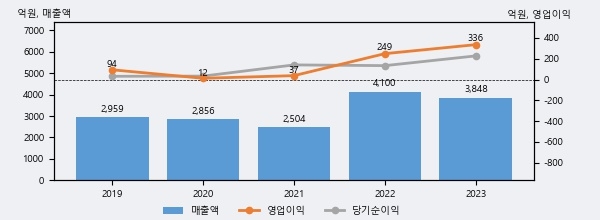 세진중공업은 2023년 매출액 3848억원과 영업이익 336억원을 기록했다. 전년대비 매출은 -6.2% 하락했고, 영업이익은 34.7% 상승했다. 이 회사의 매출액 증감률과 영업이익 증감률은 각각 코스피 하위 33%, 상위 32%에 해당된다.