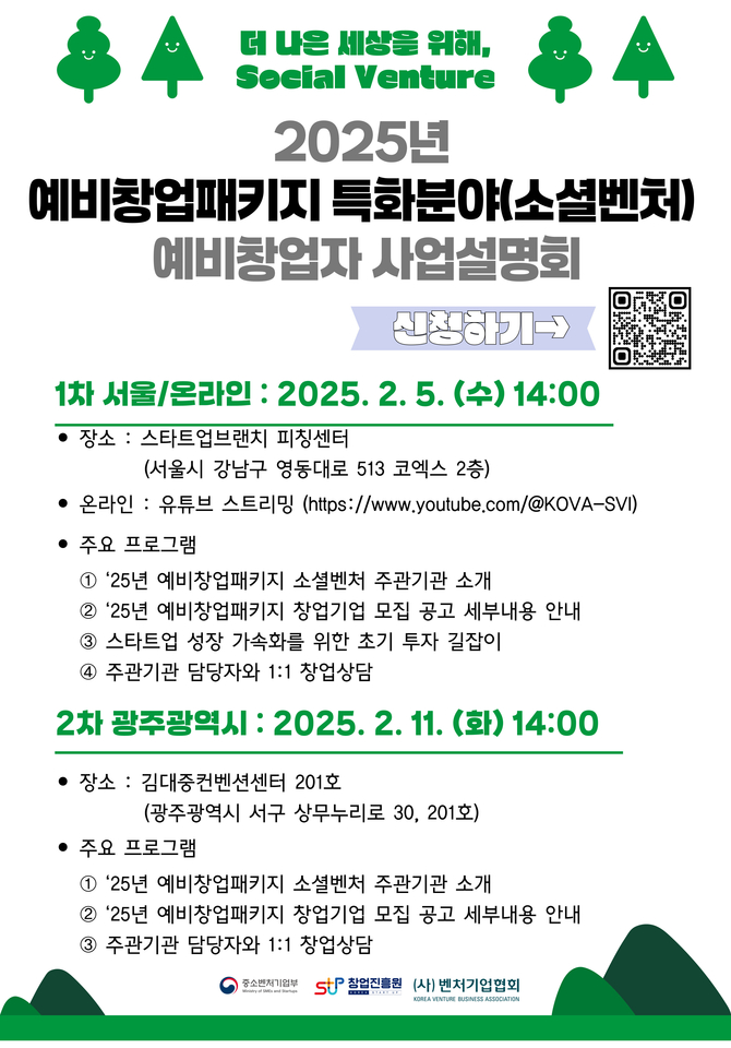 (조세금융신문=최주현 기자) 벤처기업협회는 다음 달 5일 서울 강남구 스타트업브랜치에서 '2025년 예비창업패키지 소셜벤처 사업설명회'를 개최한다고 31일 밝혔다.