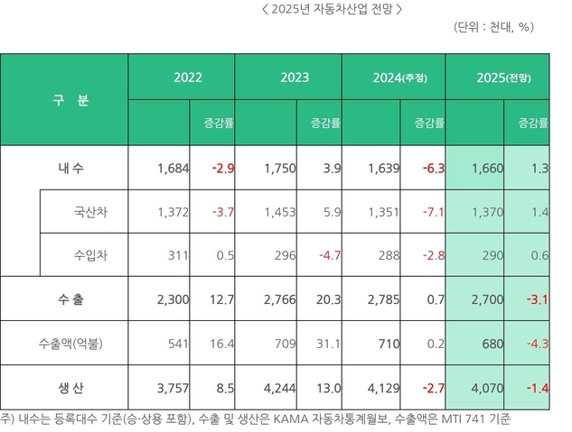 한국자동차모빌리티산업협회(KAMA)가 최근 발표한 2025년 국내 자동차 산업 전망에 따르면, 2025년 자동차 산업 내수는 2024년 대비 소폭 증가할 것으로 보인다.. 하지만 수출과 생산은 감소할 것으로 예상됐다. KAMA에 따르면, 수출은 지난 4년 연속 증가했지만 올해는 현지화 비중 증가 등으로 약 3.1% 감소할 것으로 전망됐다. 이에 따라 생산도 1.4% 줄어들 전망이다.