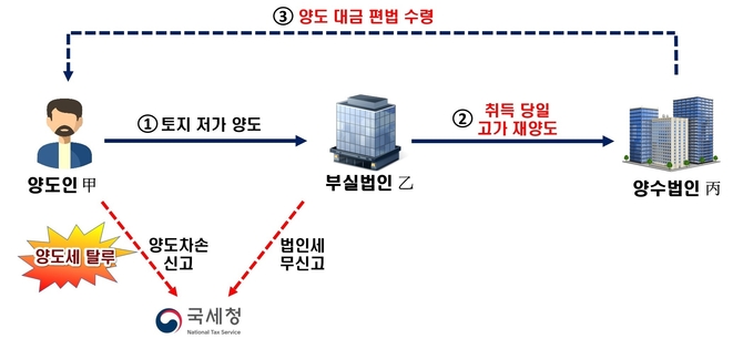 양도인 甲은 십년 이상 보유한 토지를 사실상 휴·폐업 상태에 있던 부실법인 乙에 취득가액 보다 낮은 가액으로 손실받고 판 것처럼 꾸며 양도소득세를 0원으로 만들었다. 양도소득세를 내려면 판 가격이 산 가격보다 높아야 한다.