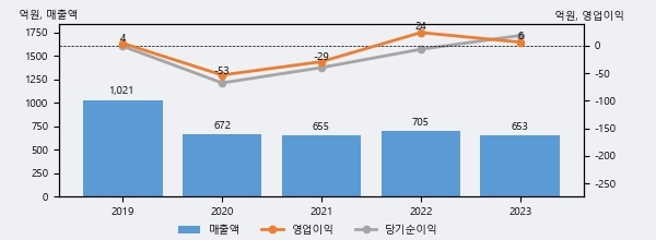형지I&C은 2023년 매출액 653억원과 영업이익 6억원을 기록했다. 전년대비 매출은 -7.3%, 영업이익은 -72.8% 각각 하락했다. 이 회사의 매출액 증감률과 영업이익 증감률은 각각 코스닥 하위 37%, 하위 26%에 해당된다.