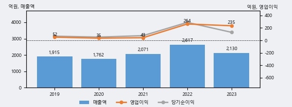 DSR제강은 2023년 매출액 2130억원과 영업이익 235억원을 기록했다. 전년대비 매출은 -18.6%, 영업이익은 -10.9% 각각 하락했다. 이 회사의 매출액 증감률과 영업이익 증감률은 각각 코스피 하위 12%, 하위 44%에 해당된다.