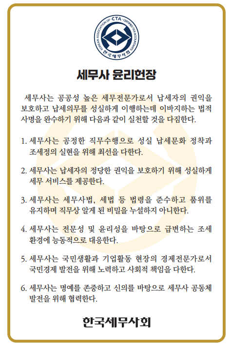 세무사 윤리헌장에는 국민이 기대하는 바람직한 세무사의 윤리상을 분명히 하고, 납세자 권익 보호와 조세 정의 실현을 핵심 가치로 삼아 세무사의 법적 사명과 사회적 책임을 명확히 담고 있다.