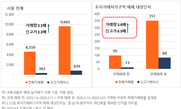 부동산 플랫폼 직방이 7일 거래 데이터를 분석한 자료에 따르면, 규제 해제 발표 다음 날인 2월 13일부터 재지정 전인 3월 23일까지 39일간 잠·삼·대·청 지역에서 총 353건의 거래가 이뤄졌다. 이는 직전 같은 기간의 99건과 비교해 무려 3.6배 증가한 수치다.