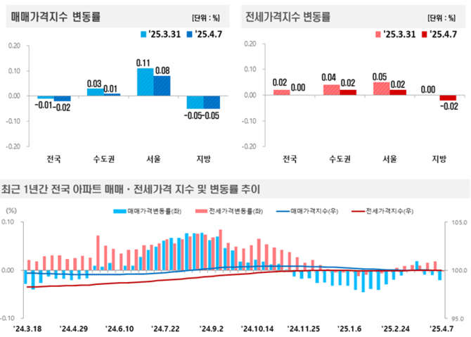 한국부동산원이 발표한 ‘2025년 4월 1주(4.7일 기준) 전국 주간 아파트 가격 동향’에 따르면, 전국 아파트 매매가격은 전주 대비 0.02% 하락했고, 전세가격은 보합을 기록했다.