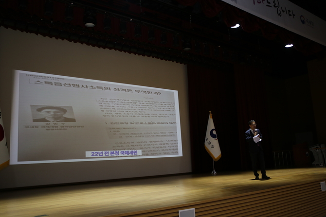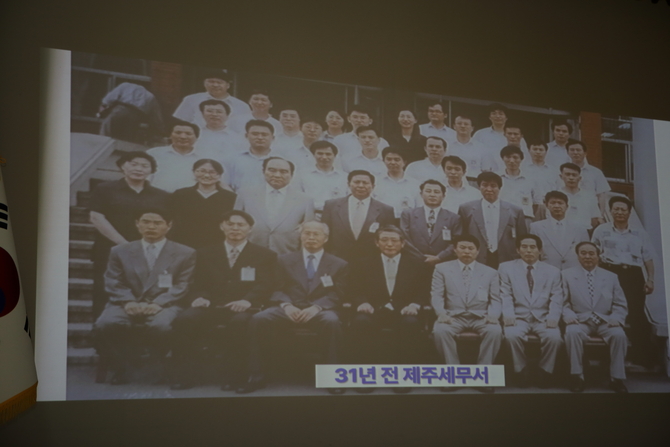 “이게 31년 전 제주세무서인데 이게 접니다. 이 화면에 제 동기가 또 한 사람 있는데 제 행정고시 동기가 혹시 누군지 아세요? 제가 26대 국세청장이고요. 이 분이 25대 국세청장 김창기 청장입니다. 제가 31년 전 초임 때 사진이고요.”