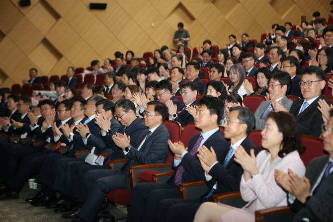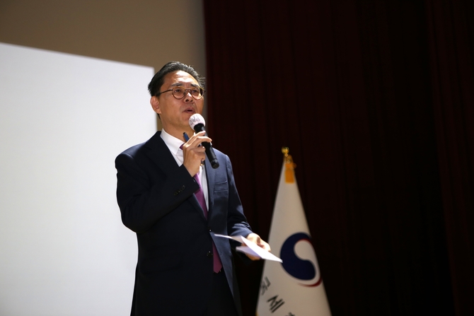 승진자들의 특별영상과 소감이 끝난 후 강민수 제26대 국세청장이 그늘진 단상 위에 섰다.