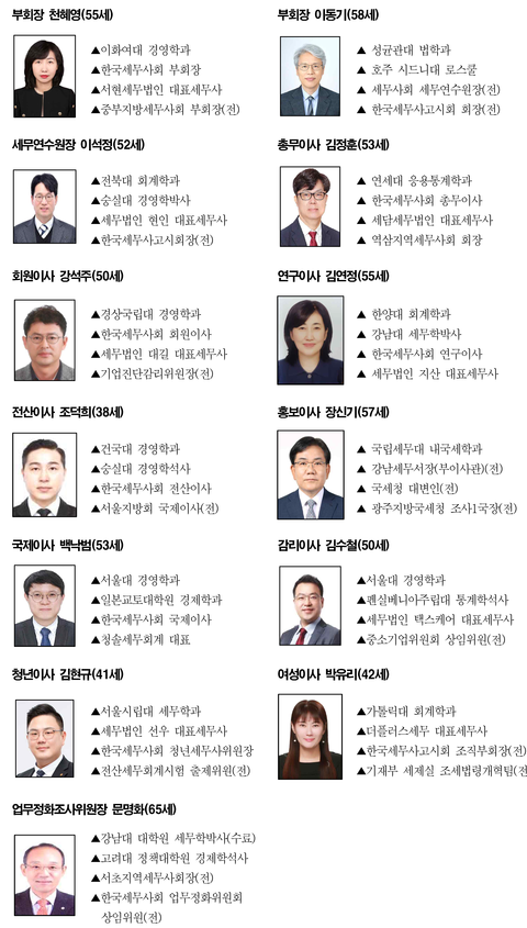 앞으로 2년간 제34대 한국세무사회를 이끌 상임이사진에는 30대부터 60대까지 회원 구성에 맞춰 다양한 경험과 역량을 갖춘 세무사들로 구성되었으며, 지난 2년간 구재이 회장과 함께 손발을 맞춰온 임원 외에도 전문성과 혁신 의지를 갖춘 새 인물들이 깜짝 수혈되었다.