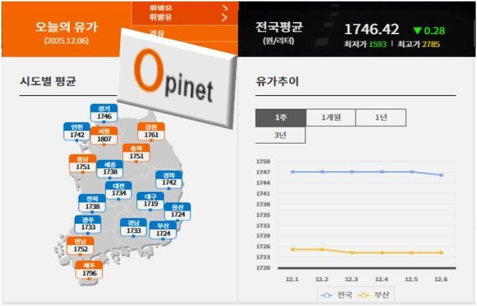 6일 한국석유공사 유가정보시스템 오피넷에 따르면 12월 첫째 주(11월 30일∼12월 4일) 전국 주유소 휘발유 평균 판매가는 지난주보다 L당 1.7원 오른 1천746.7원이었다.