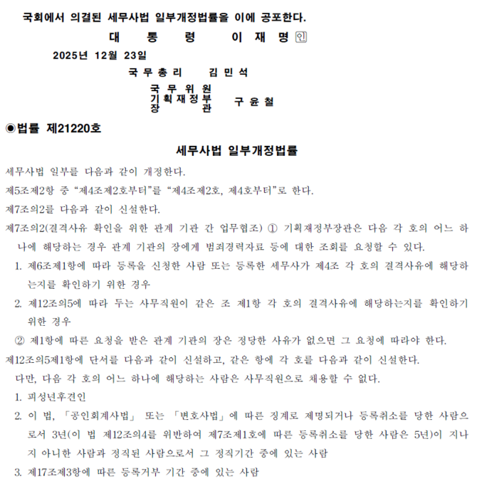 한국세무사회(회장 구재이)는 지난 12월 3일 국회 본회의를 통과한 ‘세무사법 일부개정법률안’이 23일 공식 공포(법률 제21220호)됐다고 밝혔다. 이번 개정안은 전문자격사 제도의 근간을 뒤흔들던 외부 침해 시도를 차단하고 세무사의 직무 독립성을 강화하는 내용을 골자로 하고 있다.