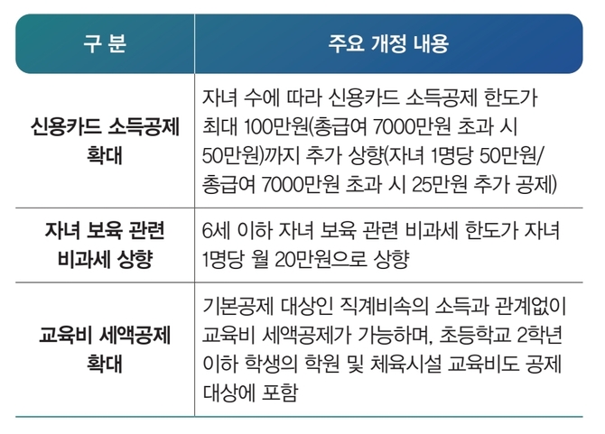 봉급 생활자의 신용카드 등 소득공제 한도가 자녀 수에 따라 추가된다. 자녀 및 손자녀 등 부양가족 1명당 50만원(총급여 7000만원 초과 시 25만원)씩, 최대 100만원까지 추가 공제가 가능해져 다자녀 가구의 세 부담이 크게 줄어들 전망이다.