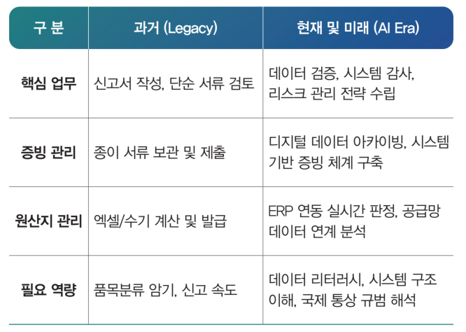 기계가 데이터를 분석한다면, 전문가는 데이터를 해석하고 전략을 설계해야 한다. 관세 전문인력의 역할이 단순대행에서 리스크 관리자이자 데이터 검증자, 정책 해석자로 확장되는 이유가 여기에 있다.