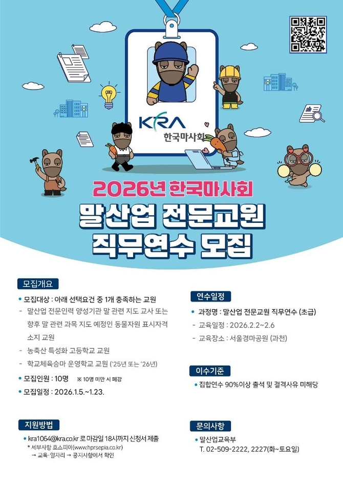 (조세금융신문=최주현 기자) 한국마사회는 18일 말산업 전문 교원 직무연수 참가자를 모집한다고 밝혔다.