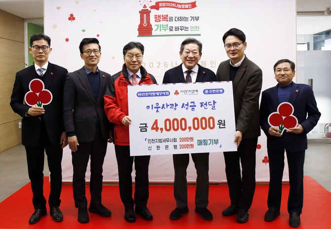 이번 성금은 인천지방세무사회와 신한은행이 체결한 매칭기부 협약에 따라 마련된 것으로, 인천지방세무사회 기부액에 신한은행이 동일한 금액을 더해 각 200만원씩 총 400만원의 후원금이 조성됐다.