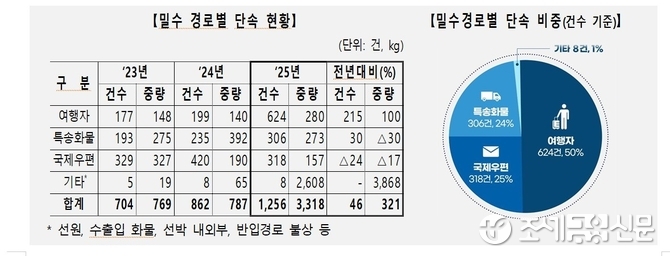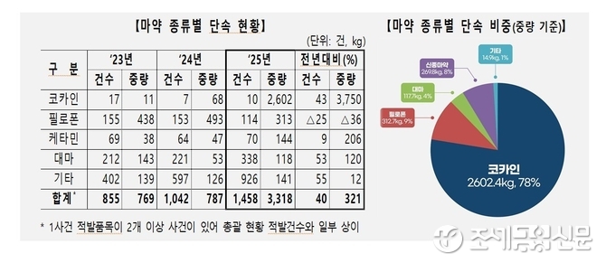 (조세금융신문=안종명 기자) 관세청이 지난 2025년 한 해 동안 국경 단계에서 총 1,256건, 3,318kg의 마약류를 적발하며 건수와 중량 모두 역대 최고치를 기록했다.