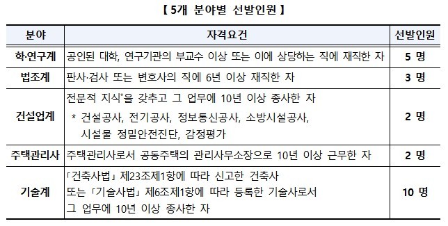 이번 공모는 다음 달 28일 8기 위원들의 임기 만료에 따른 것으로 학·연구계(5명), 법조계(3명), 건설업계(2명), 주택관리사(2명), 건축사·기술사(10명) 등 5개 분야별 전문가를 대상으로 한다.