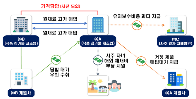 ㈜A는 사주 일가 지배법인 ㈜C에게 유지보수비용을 과다 지급하는 방식으로 담합 이익 수십억원을 챙겼고, 담합 이익을 은닉하기 위해 계열사에 거짓으로 제품 매입대가를 지급하여 이익 수십억원을 빼돌렸다.